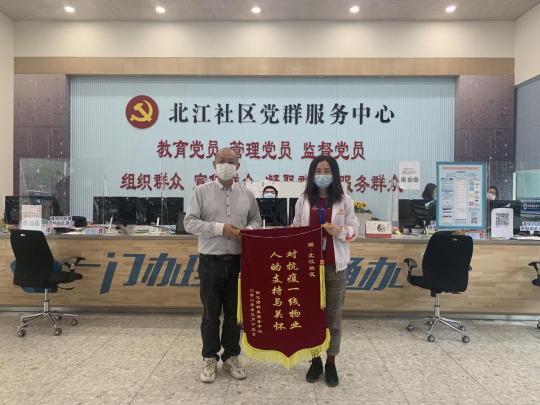 御龙湾物业用这样的方式向北江社区致敬,表达他们对社区抗击疫情工作的支持和感谢。锦旗代表着信任与肯定,代表着社区疫情防控工作得到了辖区居民的认可,这对社区逆行者来说,是激励,更是责任。